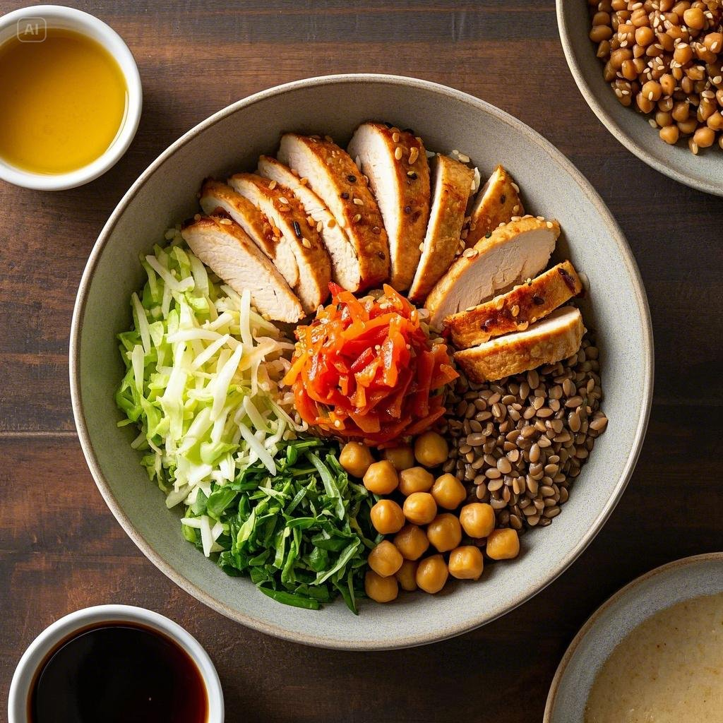 - 큰 그릇에 현미밥(및 귀리)을 담고, 준비한 렌틸콩, 병아리콩, 닭가슴살, 양배추, 토마토를 보기 좋게 올립니다.