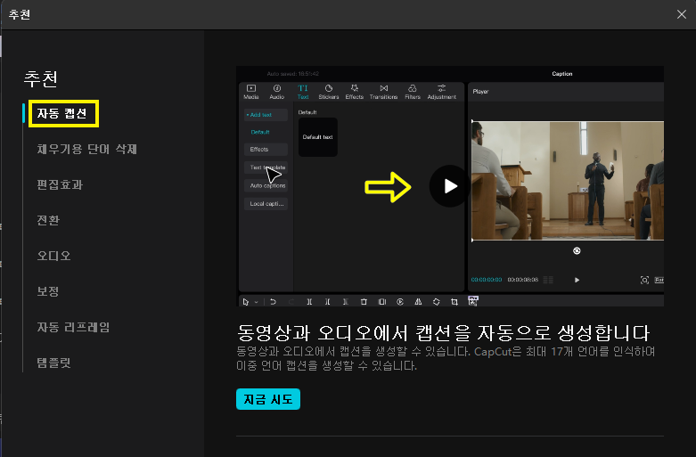 추천 화면에서 자동 캡션 선택 후 옆 동영상을 클릭하여 사용 방법을 확인합니다.