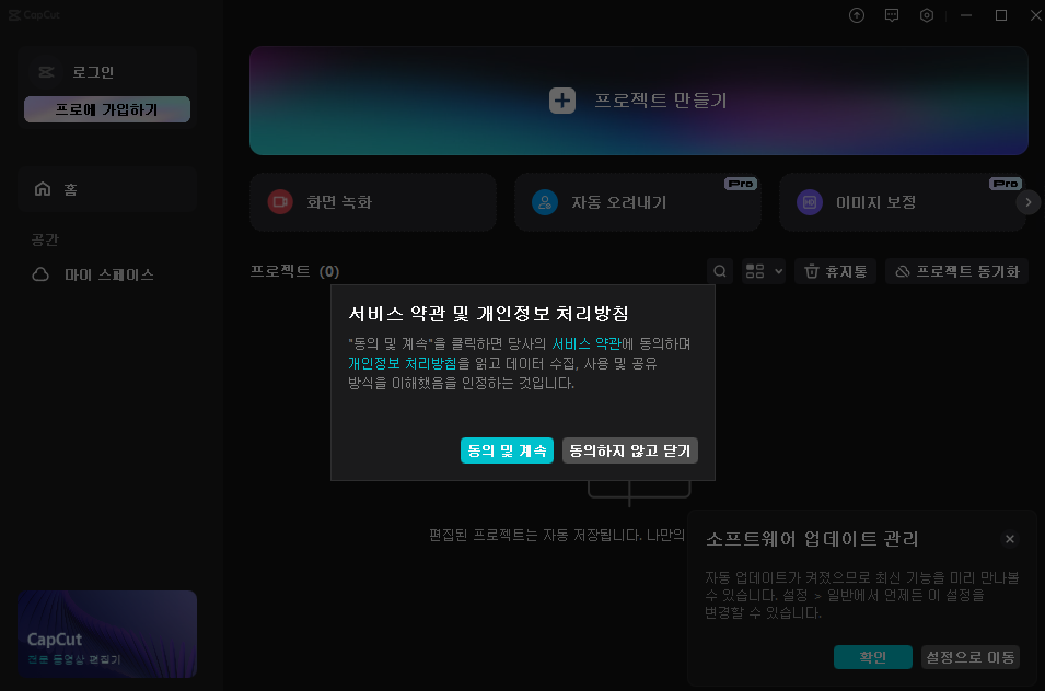처음 실행하면 아래와 같은 화면이 나옵니다. 약관 동의 및 계속 클릭