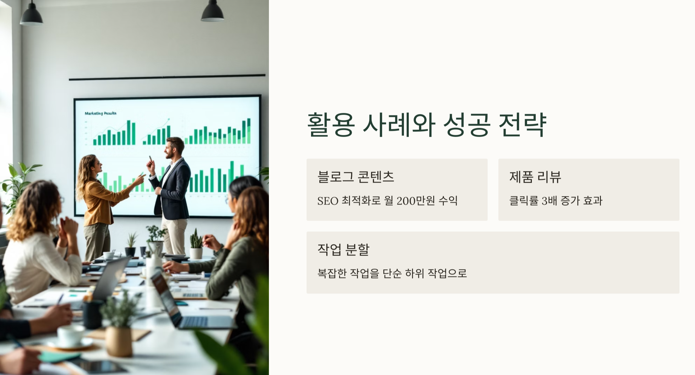 - 사례 1: 한 블로거는 GPT로 SEO 최적화된 글을 작성해 월 200만 원의 애드센스 수익을 달성했습니다.