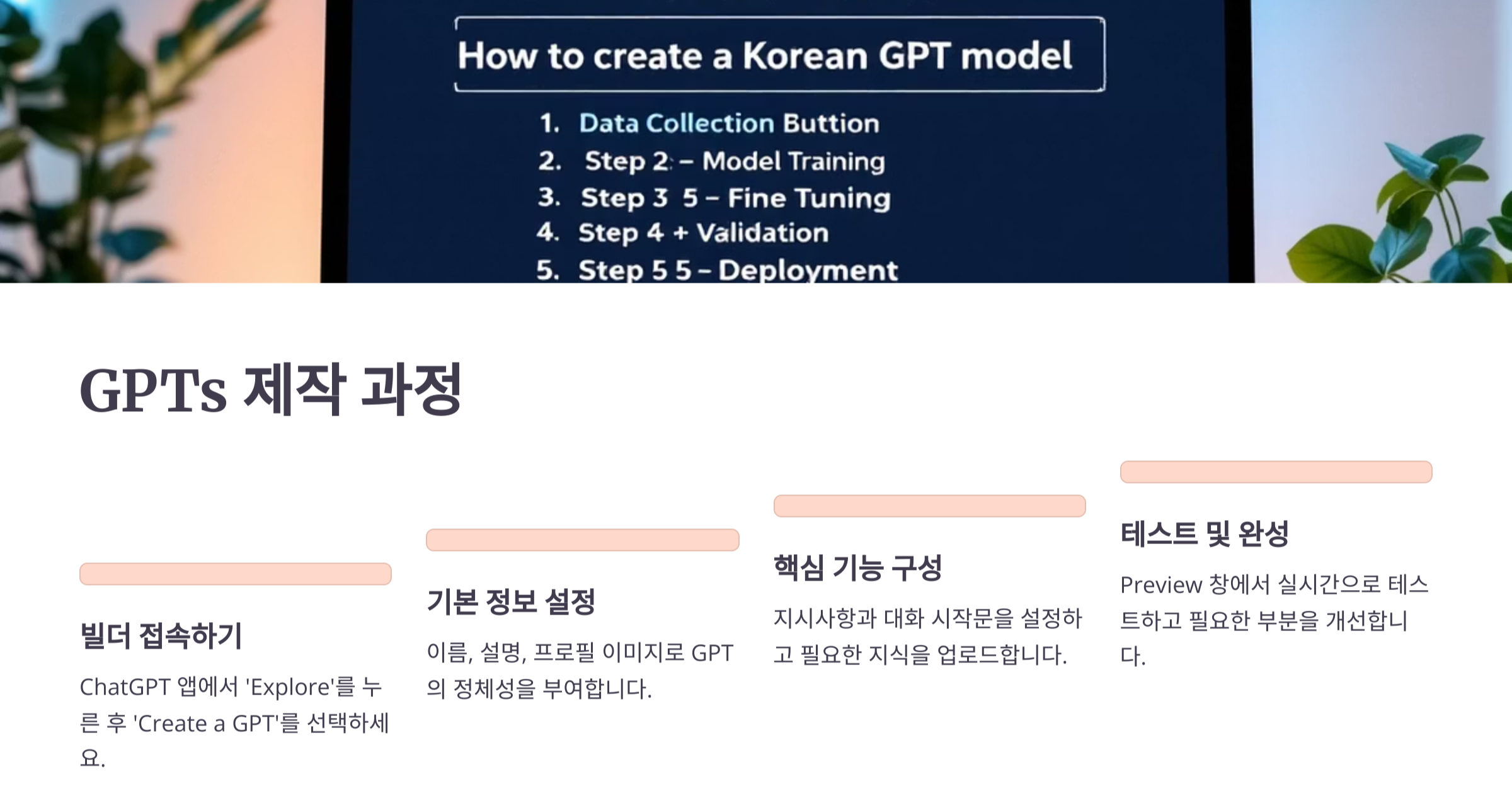이제 본격적으로 GPTs를 만들어볼게요. OpenAI의 GPT 빌더를 사용해 5단계로 나눠 설명할게요.