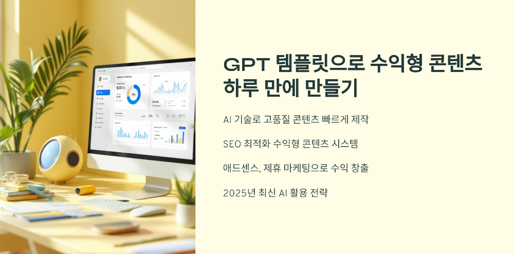 GPT 템플릿을 활용하면 수익형 콘텐츠를 단 하루 만에 만들 수 있습니다! SEO 최적화, 블로그 수익, 콘텐츠 제작, GPT, 자동화 키워드를 포함해 1000자 내외의 간결한 마크다운 가이드로, 초보자도 쉽게 따라 할 수 있도록 준비했습니다. 이모지로 가독성을 높였어요! 😊 하루 만에 블로그, 리뷰, 제휴 콘텐츠로 수익을 시작해볼까요?1. 수익형 콘텐츠란? 🤔수익형 콘텐츠는 애드센스, 제휴 마케팅, 디지털 제품 판매 등으로 수익을 창출하는 콘텐츠입니다. GPT 템플릿은 반복 가능한 프롬프트를 사용해 고품질 콘텐츠를 빠르게 생성합니다. 이점:속도: 하루 만에 블로그 포스트, 리뷰 작성.SEO 최적화: 키워드로 검색엔진 상위 노출.확장성: 템플릿으로 여러 콘텐츠 제작.목표: GPT로 작성 → 플랫폼 배..
